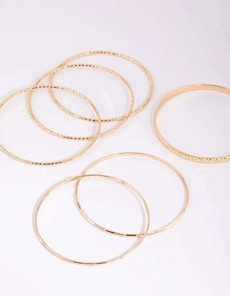 This exclusive set features six exquisitely crafted gold-toned bangles, each finished with a refined textured detail that glimmers effortlessly with every movement. Designed for the modern woman who appreciates elegance, these bangles create a sophisticated layered look when worn together, or a timeless statement when paired with your favourite gold pieces.